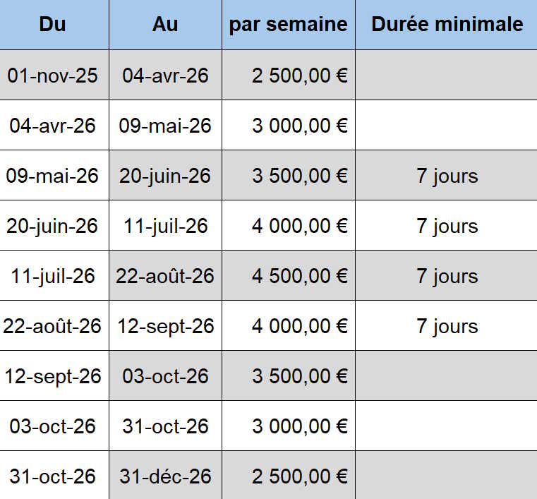 Location à la journée de 9h30 à 17h30 à partir de 400€ – repas non fournis